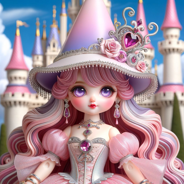 This print showcases a delightful portrait of Lady Rosie. A fantasy castle graces the background, but it's Lady Rosie who truly steals the spotlight. Her enchanting, doll-like face features large violet eyes, red lips, and a cute button nose. Her hair is a mix of pink and purple shades, accented with white highlights. She wears an elegant ball gown paired with a silver and purple necklace. This print would make a gorgeous centrepiece on any colour T-shirt.